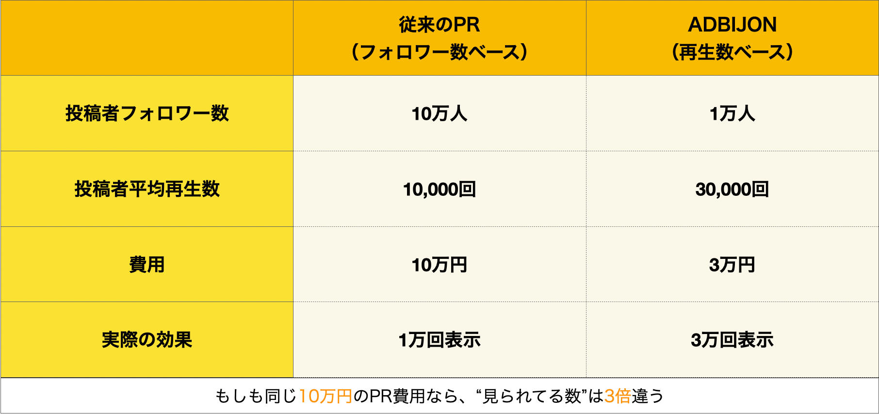 ADBIJONは、再生数=広告価値として設計された投稿型PRサービスです。